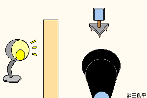 ・「光のてこ」使用方法1。 「光のてこ」は、いきなり望遠鏡をのぞいても 見える範囲が狭く苦労します。 そこでまずは望遠鏡をのぞかず、 望遠鏡の上から鏡を見て、 鏡に縮尺が映るように調節します。 注) 縮尺は電球で照らしておくと探しやすい。