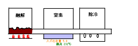 ・ 中央の室には融解したスズが水平面を保っている。スズの融点は232 ℃で金属の中では低温