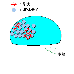 分子は必ず隣り合った分子との間に引力が働いていて,液体の内部ではこの引力は互いに打ち消される。ところが,液体の表面にある分子についてはその分子より外側には分子が無い。よって表面での引力は内向きにしか働かない。(左図参照)その時,表面張力は水滴を球に保とうとするのである。