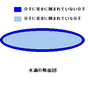 | 『分子によって完全に囲まれていない分子』の数をできるだけ少なくしようとする=水滴が球でいようとする |