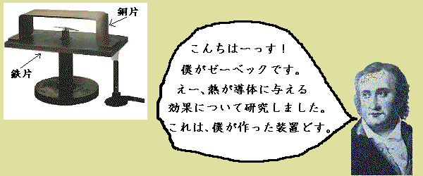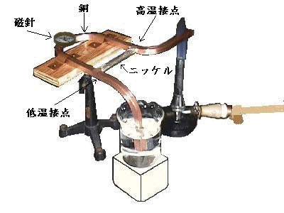 高温接点側をガスバーナーで熱し、低温接点側を氷水の入ったビーカーに浸すことで 両接点に温度差をつけます。 すると、磁針が振れます。これは電流によって銅のまわりに磁界が生じたからです。 つまり,電流が流れていることがわかりますね。 こちらに動画による解説があります。