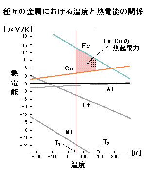 任意の二金属を取り、その両端を電気的に接続し、接合部を異なる温度に保つと回路内に起電力を生じ電流が流れる。その熱電対の起電力は、
