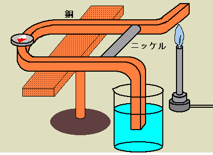 (1) 図 20−1のように銅−ニッケル熱電対の一端(低温接点 )を氷水に浸け,他の一端(高温接点 )をガスバーナーで熱する。方位磁針の動きを観察する。なぜ,磁針が振れるのか考察すること。
