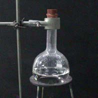 丸底フラスコ、ゴム栓、スタンド、ガスバーナー