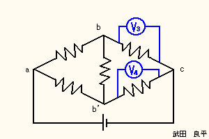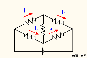 - 抵抗をそれぞれR1、R2、R3、R4とすればオームの法則より、